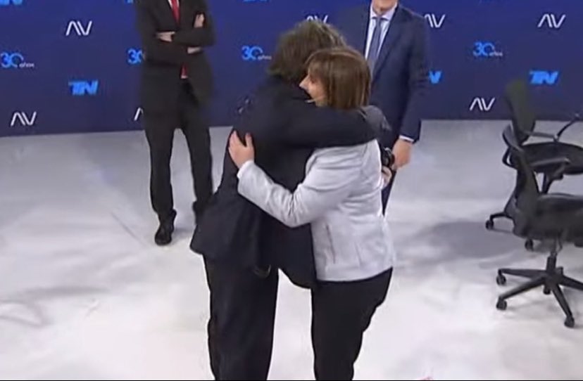 El candidato presidencial de La Libertad Avanza, Javier Milei, se mostró en público por primera vez con la líder del PRO, Patricia Bullrich, luego de que esta anunciara su apoyo al economista en el balotaje ante Sergio Massa, y se dieron un abrazo en un programa televisivo.