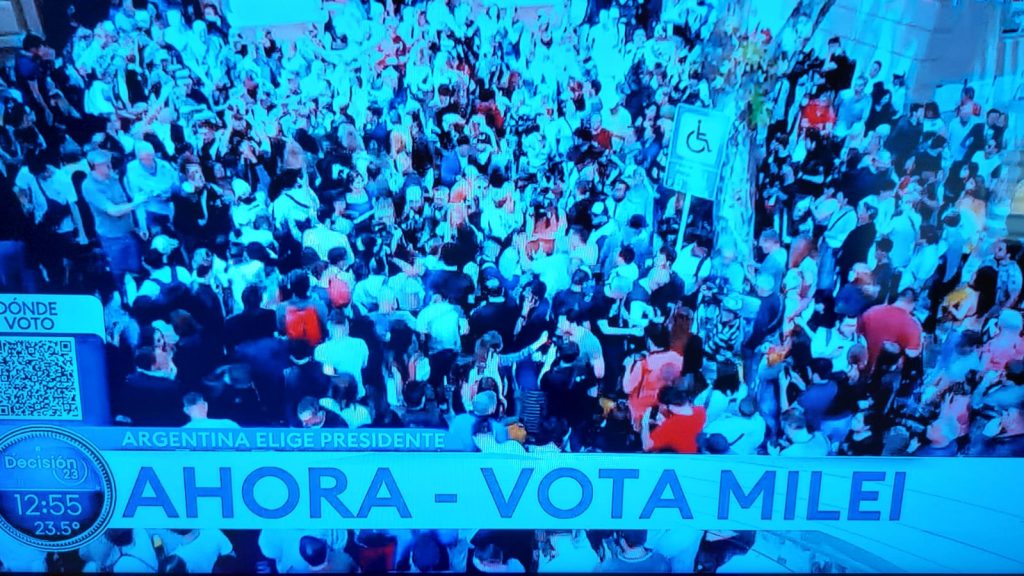 El candidato presidencial de La Libertad Avanza, Javier Milei, votó en la Universidad Tecnológica Nacional (UTN) acompañado de su hermana, Karina Milei. Cientos de militantes de su espacio lo esperaron desde temprano en la sede la institución ubicada en el barrio porteño de Almagro.